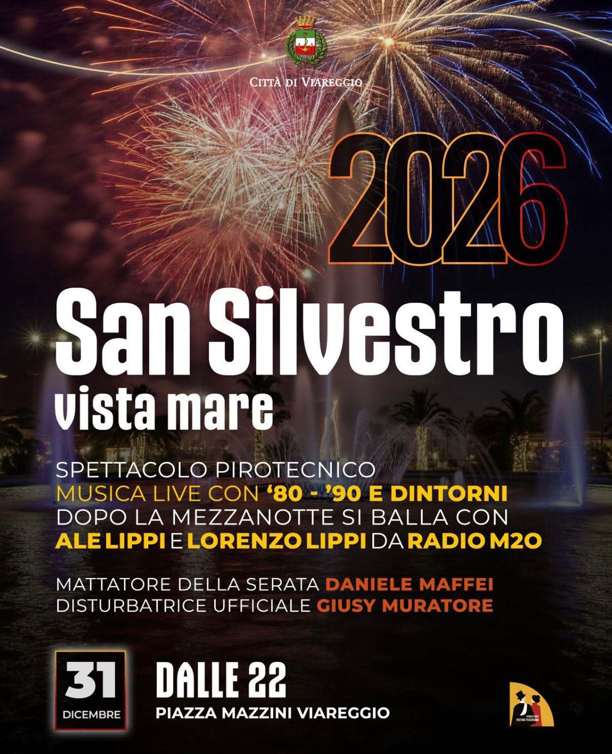 San Silvestrovista mareSPETTACOLO PIROTECNICO MUSICA LIVE CON '80-'90 E DINTORNI DOPO LA MEZZANOTTE SI BALLA CON ALE LIPPIE LORENZO LIPPI DA RADIO M20MATTATORE DELLA SERATA DANIELE MAFFEI DISTURBATRICE UFFICIALE GIUSY MURATORE31 DICEMBREDALLE 22PIAZZA MAZZINI VIAREGGIO